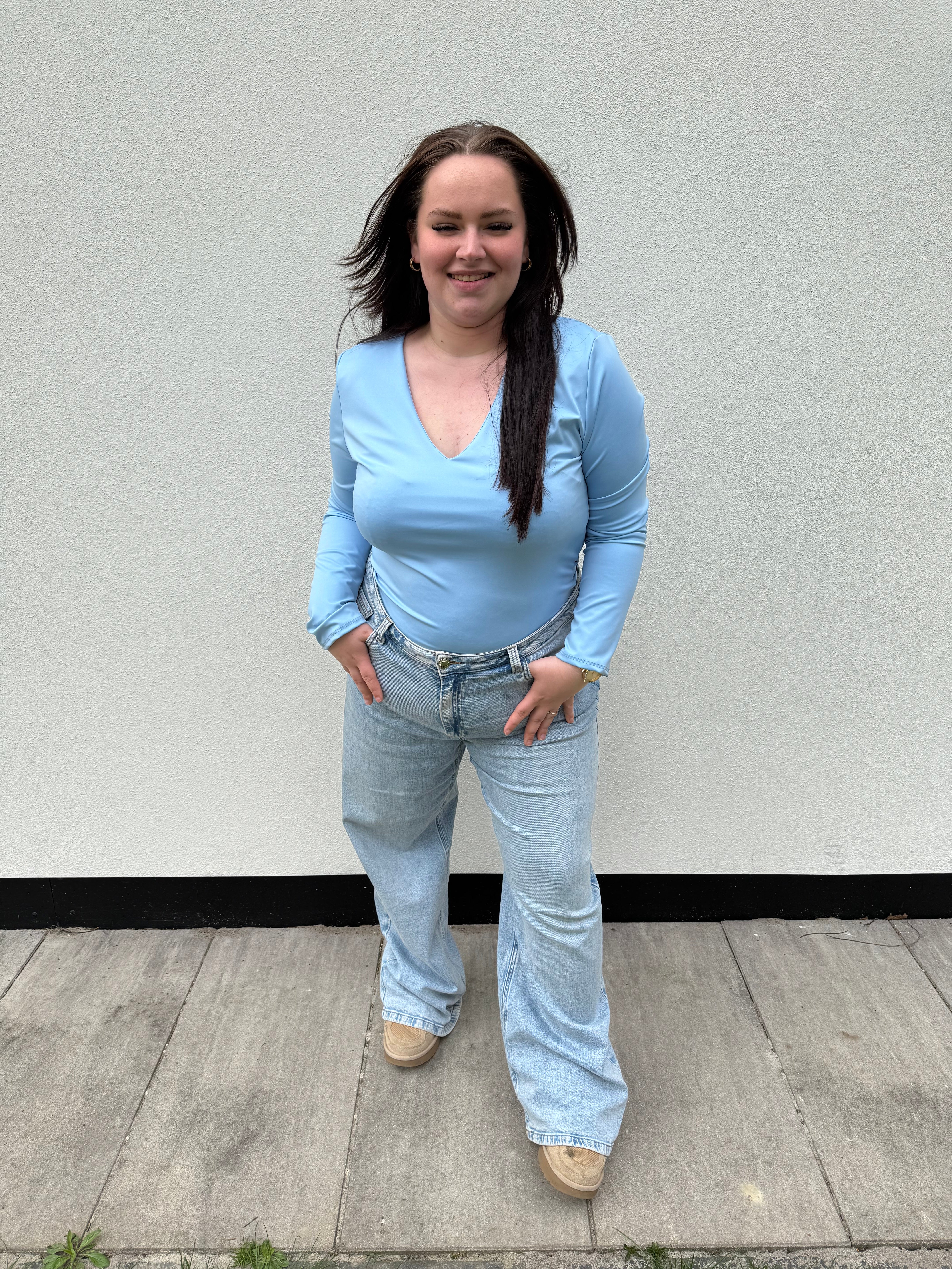 We hebben weer een héérlijke body laten maken! Deze keer op vele verzoek met een v-hals! De body schijnt deze niet door, en we hebben wederom de mouwen langer laten maken voor de ''lounge look'' en is de sluiting afgewerkt in een BH-sluiting in 3 verstelbare maten. Ook deze body is weer mega stretchy! De body draag je heerlijk los of perfect onder je blazer!