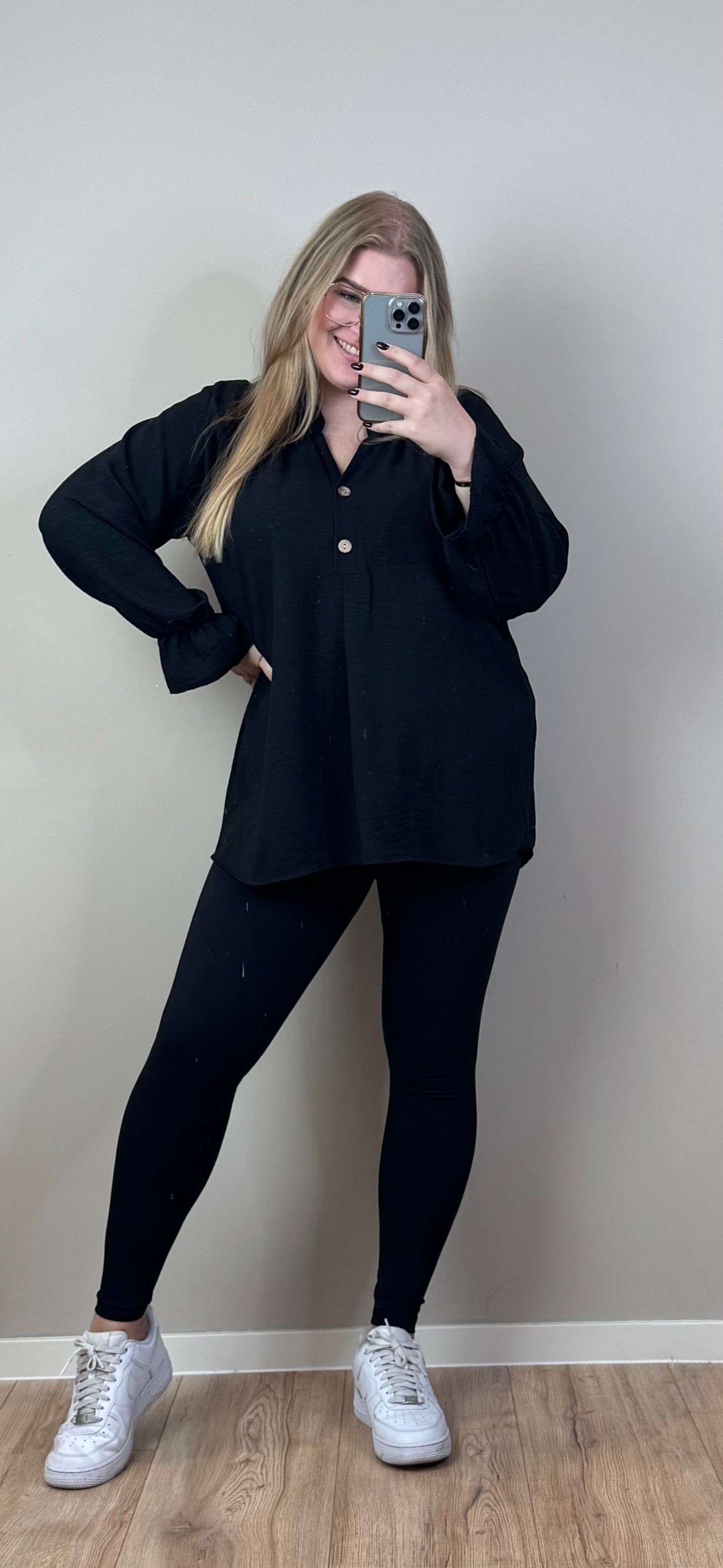 Een heerlijke basic blouse mét een touch! De blouse heeft een mooie v-hals met 2 knoopjes, valt ie lekker ruim tot over de billen en het kruis en bij de polsen zit er een elastiek waardoor deze super mooi uitloopt als trompet mouw. Dit is gewoon een must have basic voor in je kast babe!