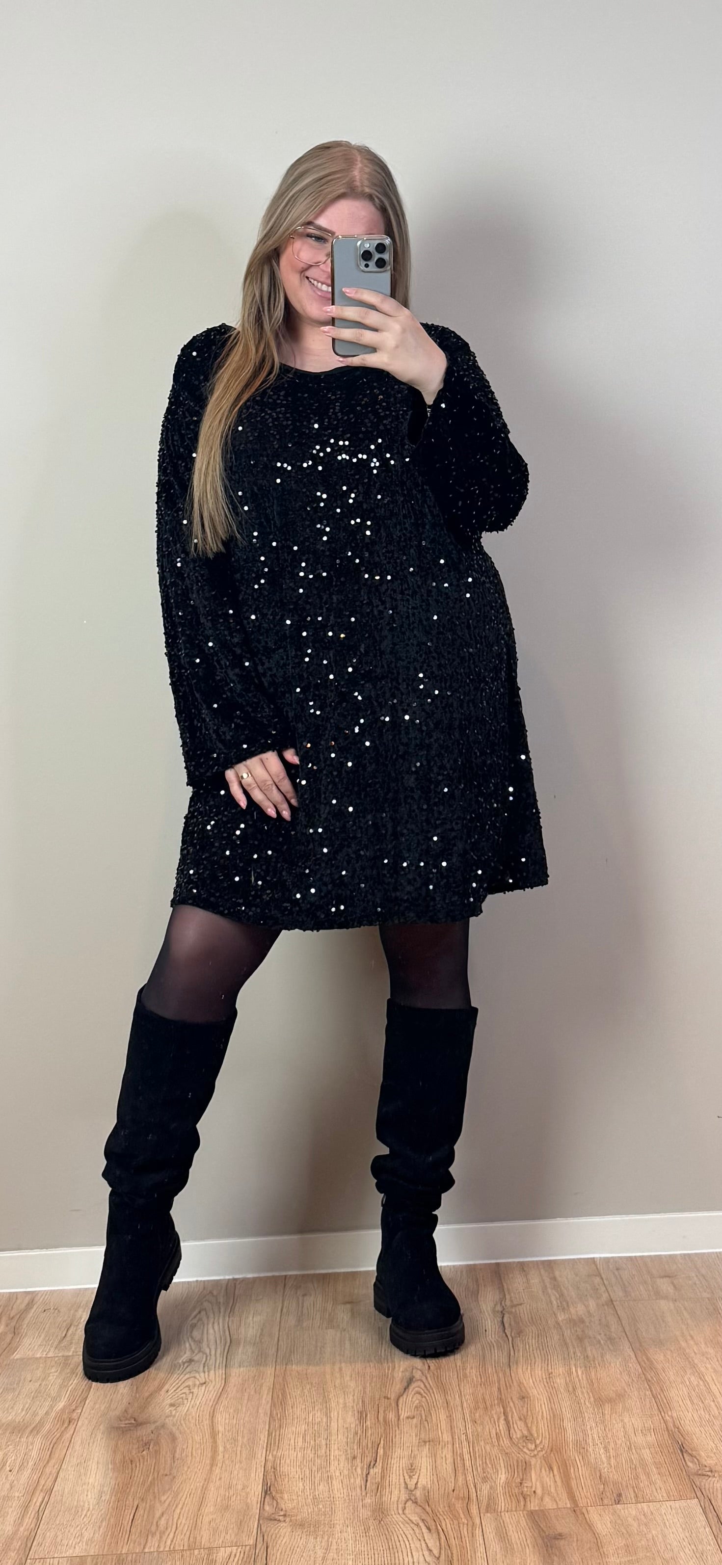 Wauw! Ik houd er toch zo van! Een jurk vol met pailletten (in dezelfde kleur als de jurk!), welke mooi om je curves heen zit en tóch lekker verhullend is! En deze jurk zit écht vol verrassingen, trust me! Hij heeft een mooie nette lengte, een ronde hals maar de details zitten 'm bij deze prachtige jurk op de rug! De jurk is aan de achterkant namelijk super mooi afgewerkt in een ''waterval model'' met een kanten detail! Ook zit er aan de achterkant een elastische taille band, hierdoor geeft de jurk een super mooie look voor in de taille én blijft ie buikje verhullend! Hoe tof!?